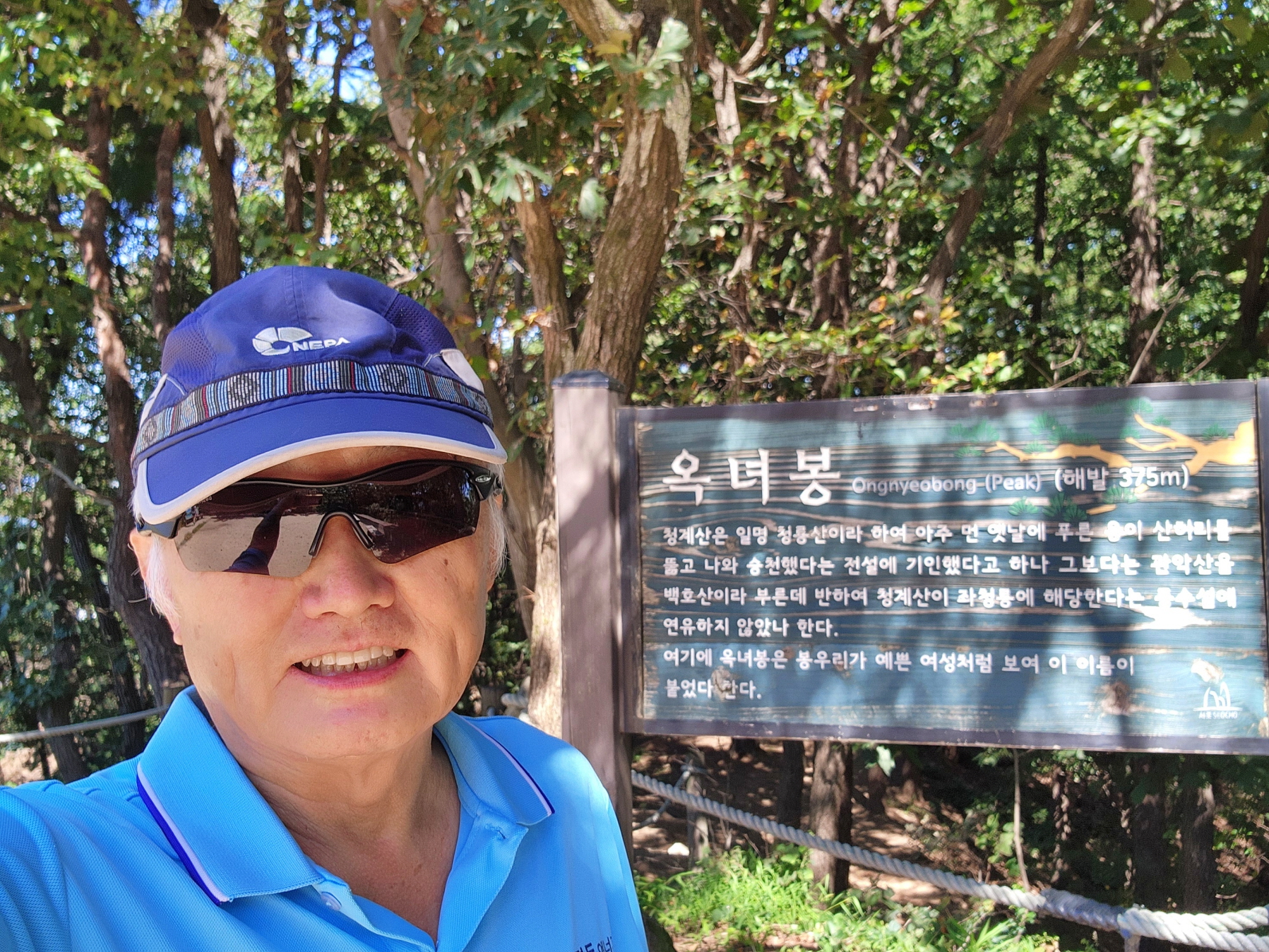 옥녀봉에서 셀카를 찍었다. 봉우리가 예쁜 여성처럼 보여서 이런 이름이 붙었다는 설명이 적혀 있다.