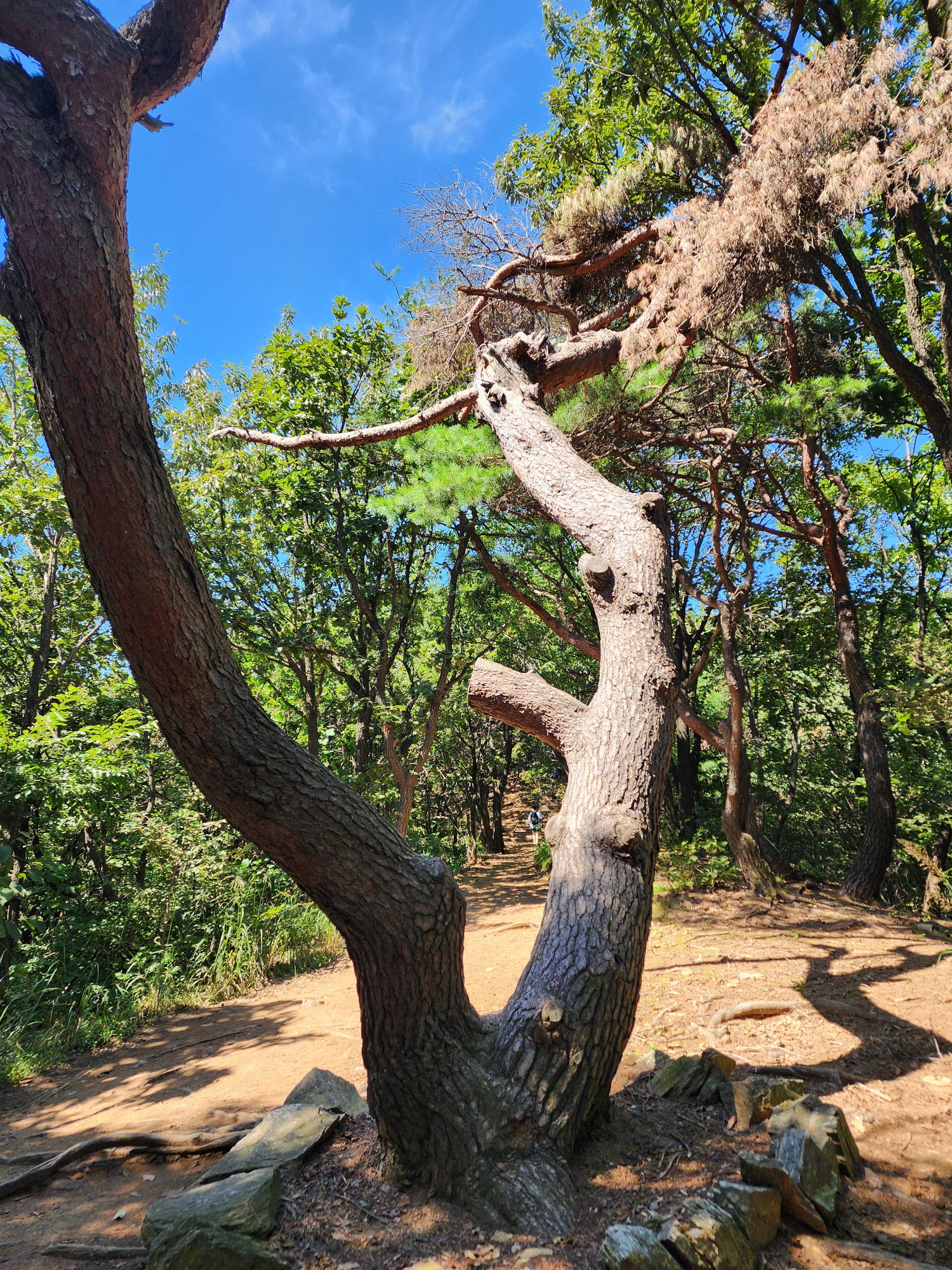 청계산의 상징과도 같은 V자형 소나무인데 한쪽 줄기는 말라죽었다.