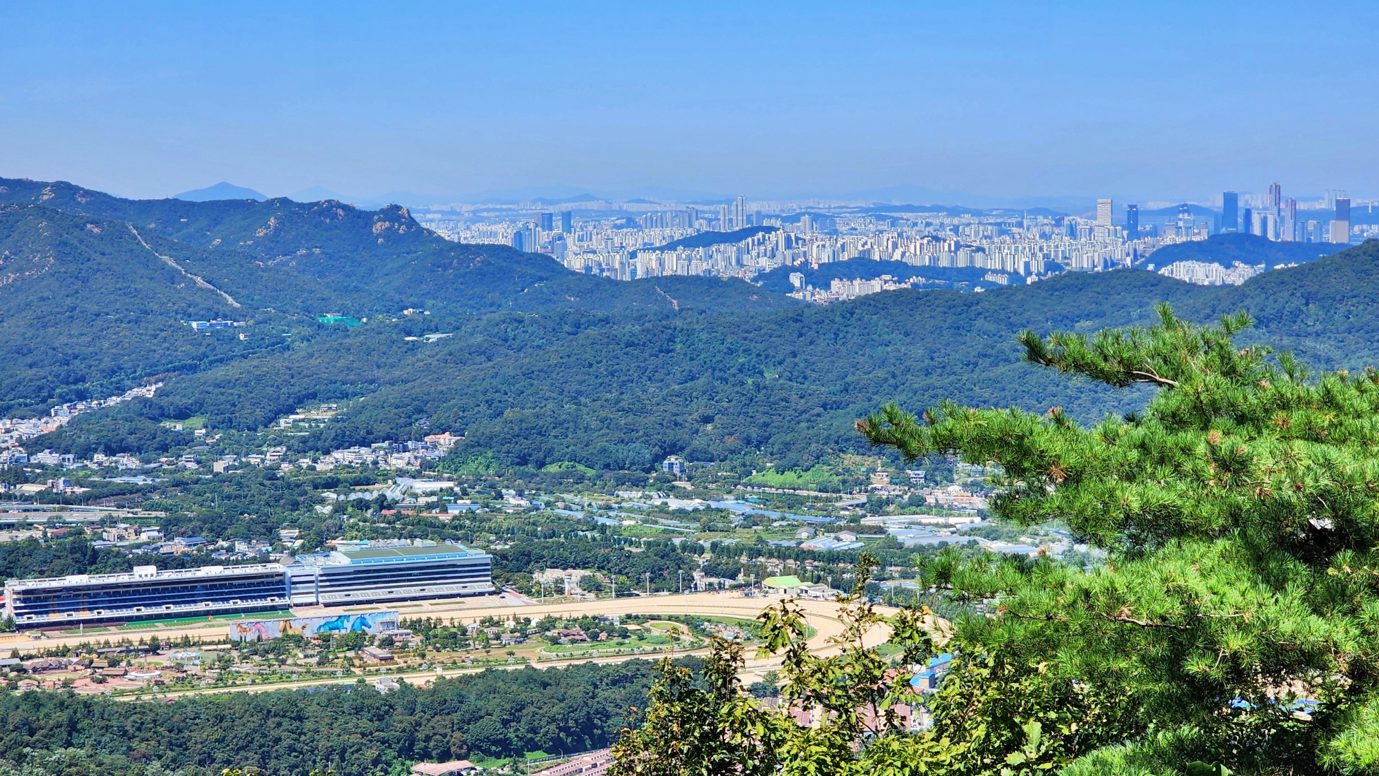 옥녀봉에서는 과천경마장이 눈 아래 보이고 멀리 서울 시내가 펼쳐진다.
