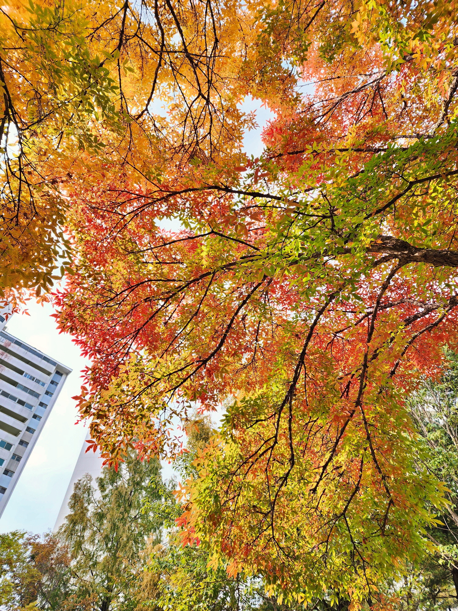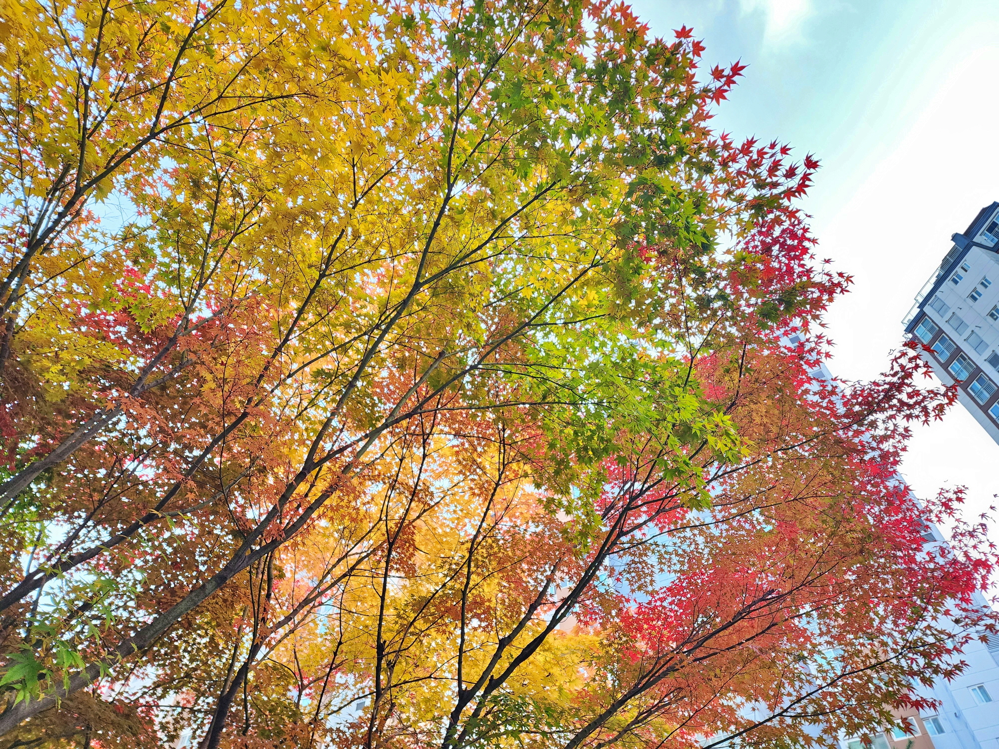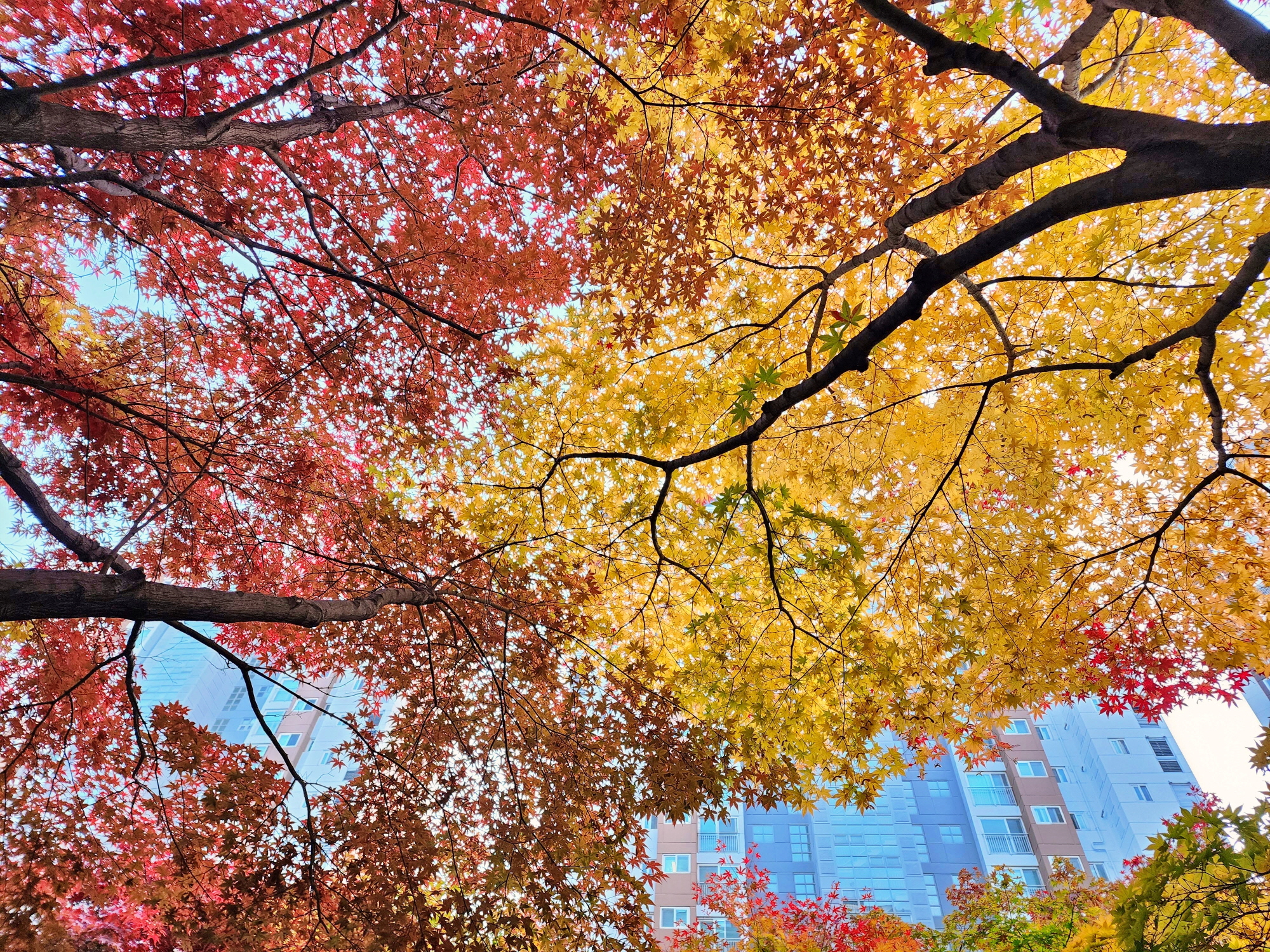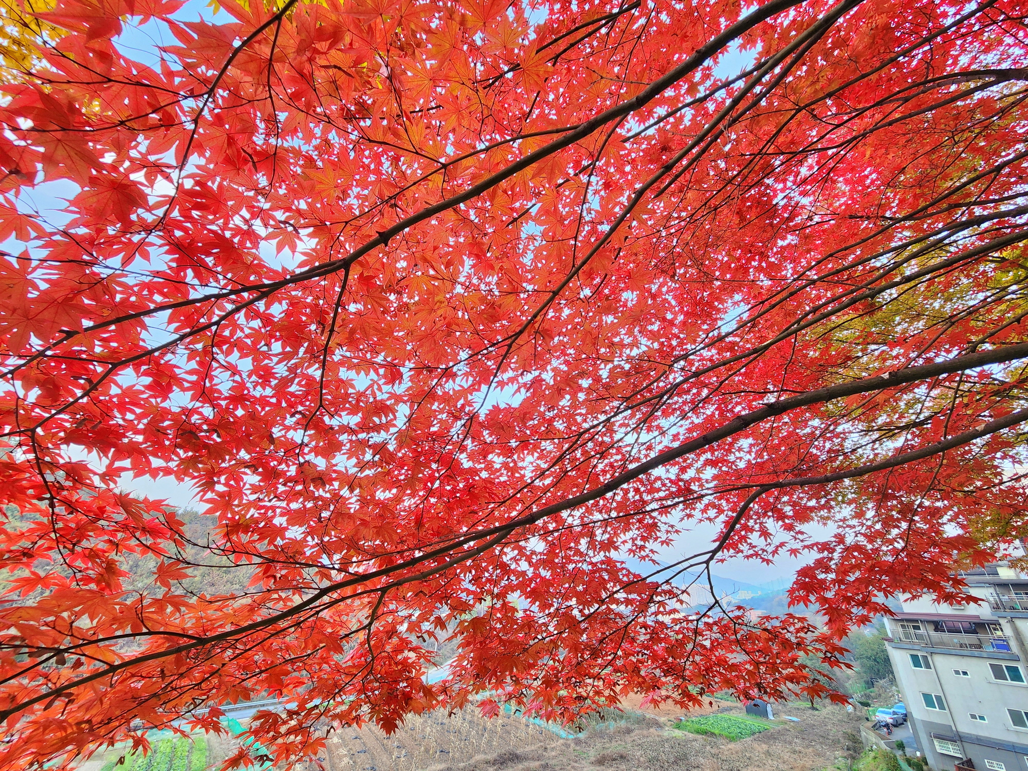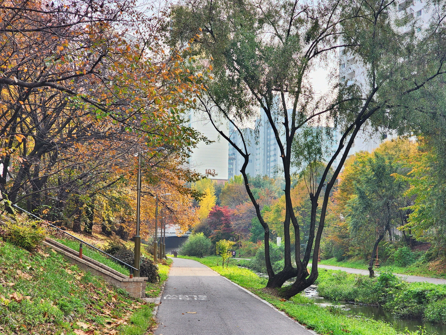 천 옆의 아파트 단지 안 단풍은 붉게 타오르고 있었다.
