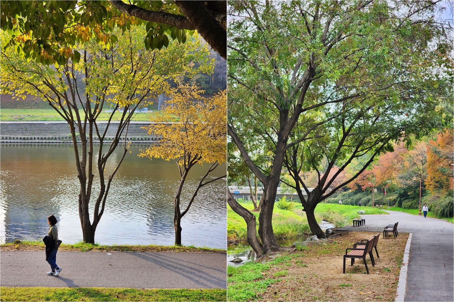 야탑 모임에 나가는 길에 여수천을 걸었다. 여수천은 가을색으로 곱게 물들어가고 있었다. 이곳 천변 길은 단풍 색깔이 화려하지 않고 은은해서 좋다.