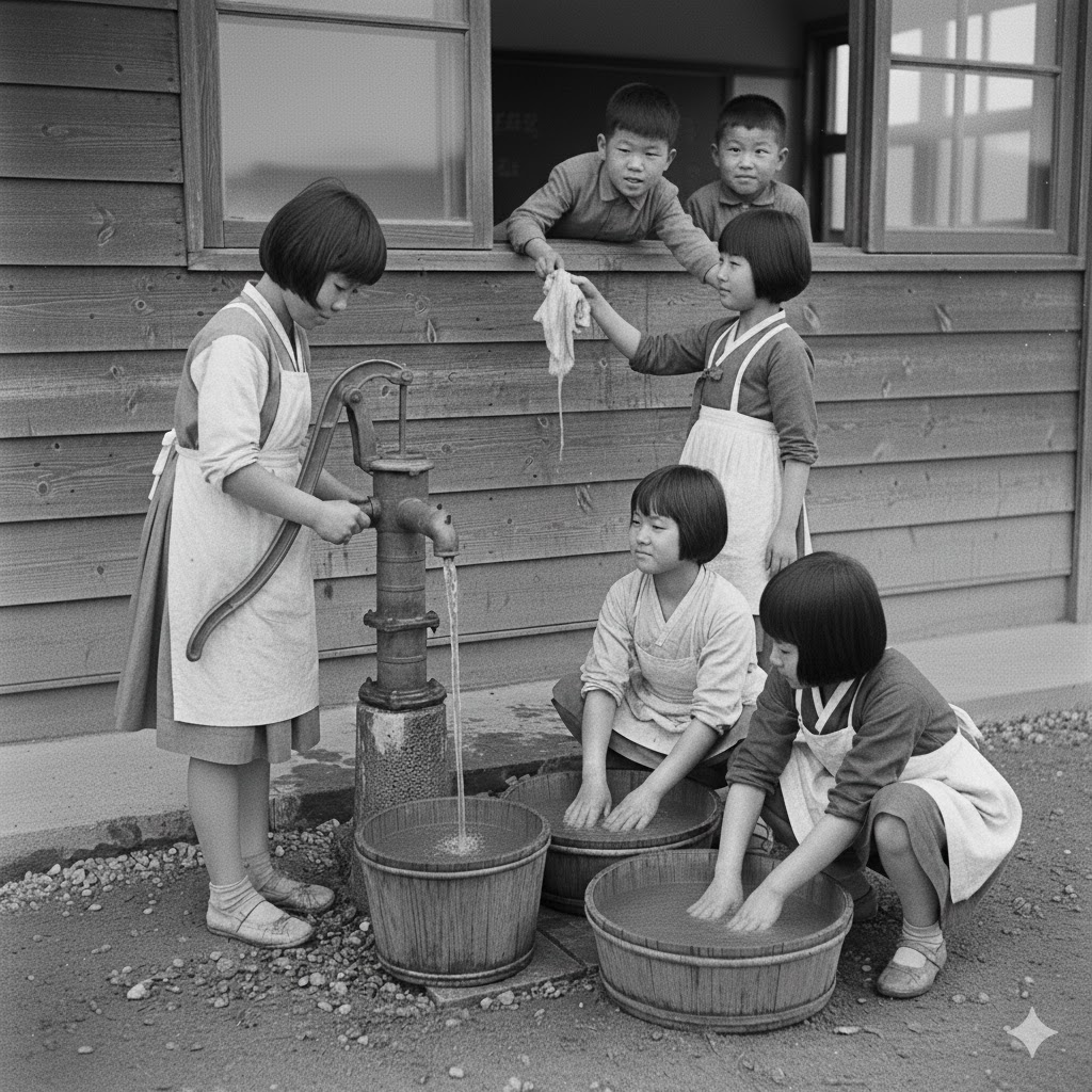 이 장면을 AI에게 부탁했더니 아래와 같은 사진을 만들어줬다. 교사 벽면이나 창문은 당시와 똑같다. 시커먼 색깔로 칠해진 나무판자를 겹쳐서 만든 교실벽으로 군대 막사 같았던 학교였다. 요사이 초등학교의 동화 같은 건물을 보면 격세지감을 느낀다. 다만 여자 아이들의 옷과 신발은 그때와 다르다. AI는 상당히 곱게 만들어줬다.