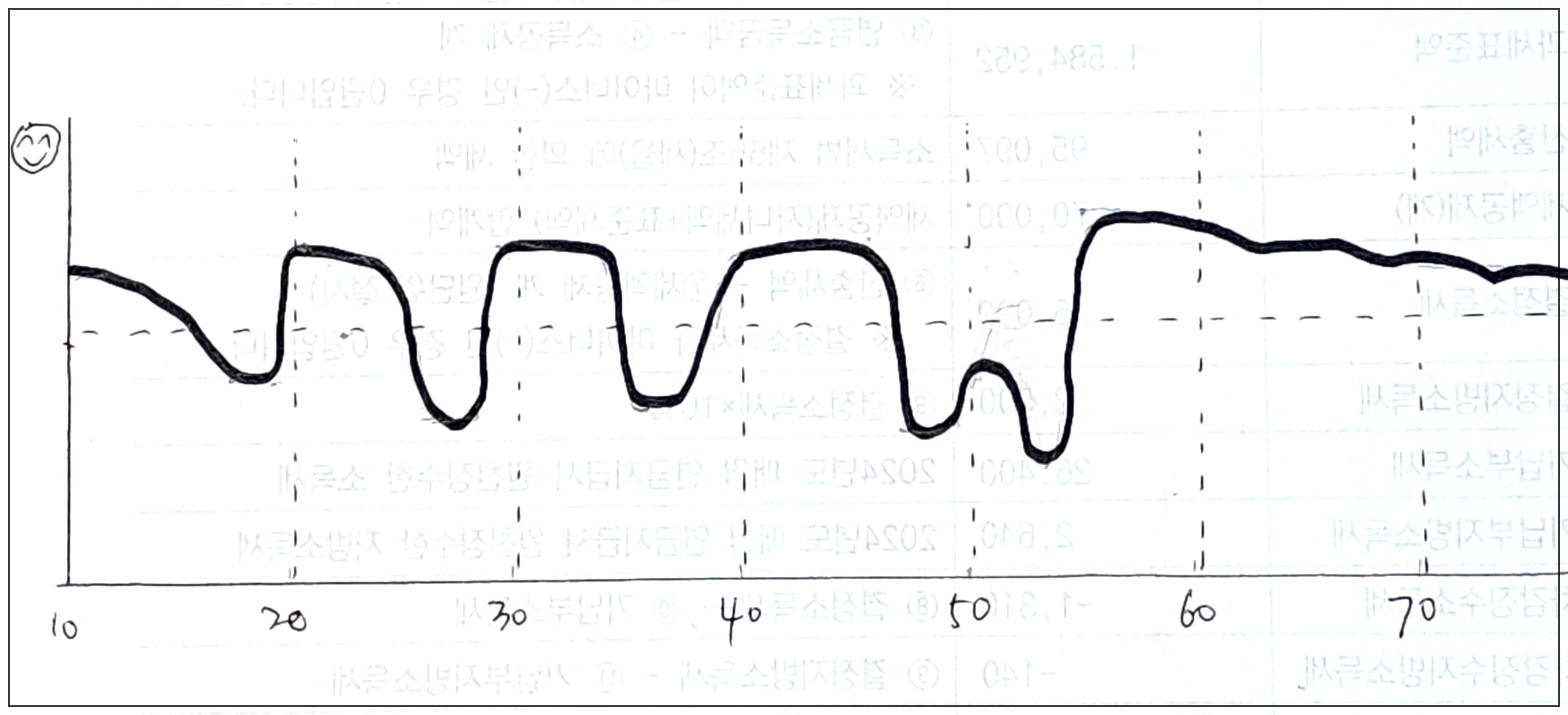 인생은 짧다면 짧고 길다면 길다. 그 짧고도 긴 길에는 수많은 고비와 우여곡절이 있다. 한숨과 탄식, 절망이 곳곳에 배어 있다. 그렇다고 눈물만 있겠는가. 기쁨과 보람이 발걸음을 가볍게 하기도 한다. 지나온 삶을 돌아보면서 행복도(幸福度)를 그래프로 그려보고 싶은 생각이 들었다. 만족도(滿足度)라고 부르는 게 더 어울릴지 모르겠다. 일흔을 넘겼으니 전체 일생을 돌아보는 일도 괜찮을 것 같다. 다른 사람에 비해서는 순탄한 인생이었을까? 그런 것 같기도 하고 아닌 것 같기도 하다. 누구나 제 손톱 밑의 가시가 제일 아픈 법이니까. 대충 그려 본 내 삶의 만족도 그래프다.