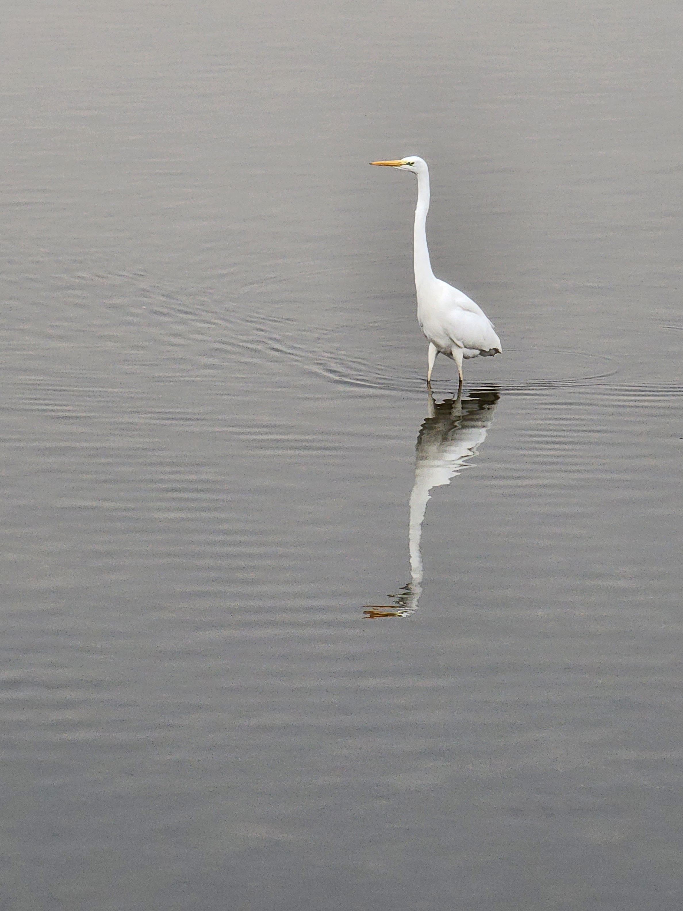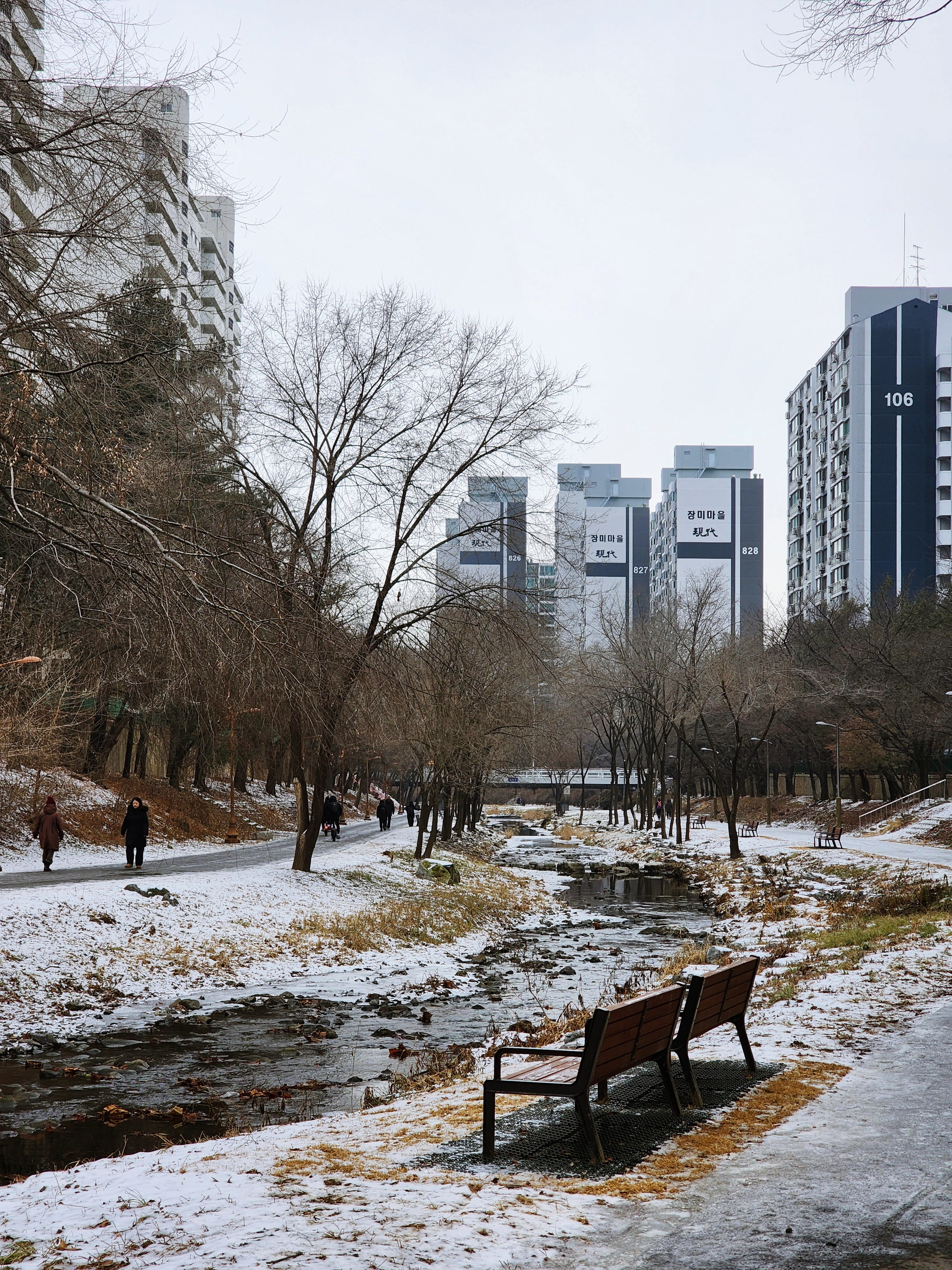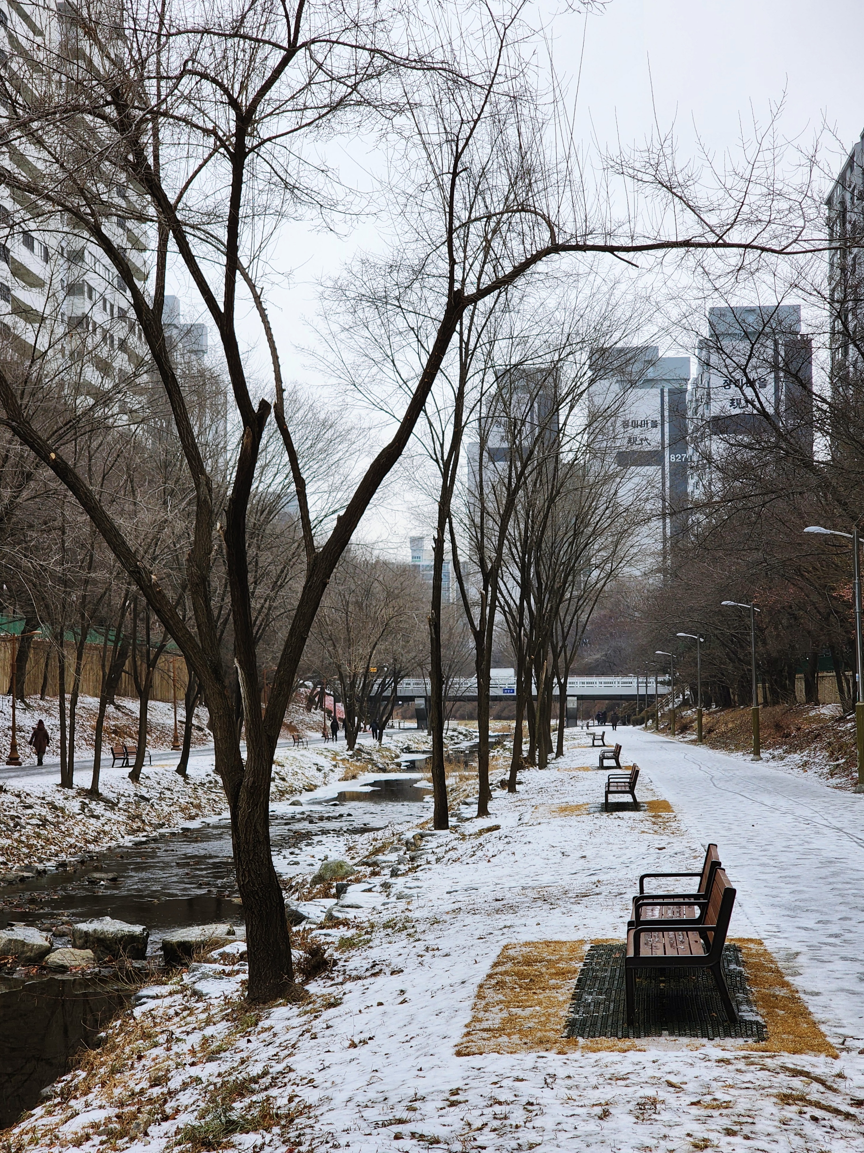 겨울 아침의 천변 산책로에는 아직 덜 녹은 눈이 깔려 있었다. 백로의 유유한 자태도 보였다.
