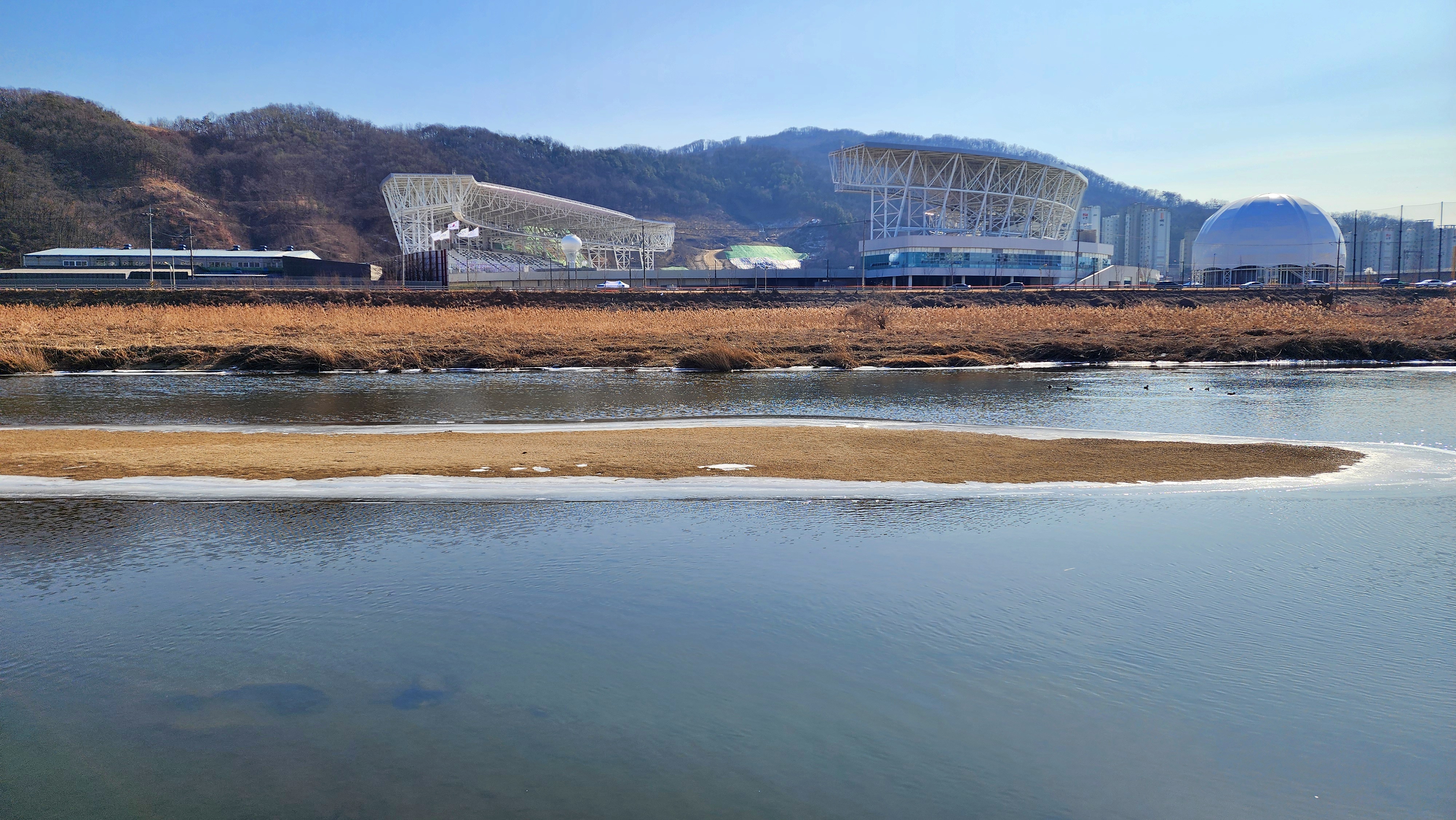 천 건너편의 G스타디움 공사는 완성 단계에 접어들었다. 올봄에 열리는 경기도 종합체육대회의 주경기장이다. 그때가 되면 육상 경기를 보러 와야겠다.