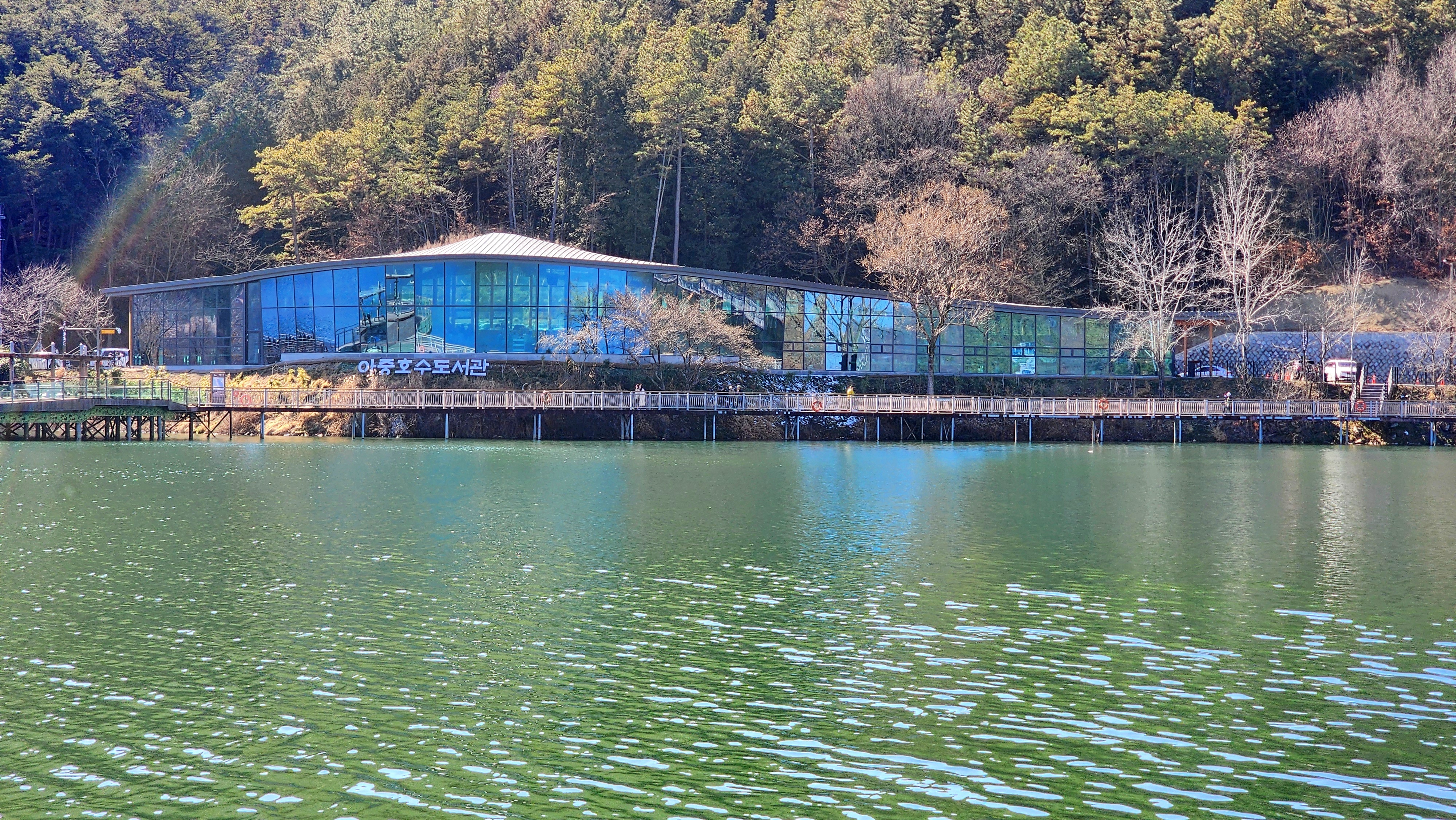 호수의 명물은 아중호수도서관이다. 한적한 호수변에 이렇게 멋진 도서관이 있다는 게 놀라웠다. 안으로 들어가 보니 책과 함께 시민들이 휴식할 수 있는 편안한 분위기가 좋았다. 책을 읽기도 하고, 호수를 바라보며 물멍을 하기도 하고, 창가에 앉아 음악을 들으며 여유롭게 시간을 보내는 모습이 아름다웠다. 특히 LP판이 다량 구비되어 있어 내가 좋아하는 음악을 골라 턴테이블에 올려놓고 호수를 바라보며 헤드폰으로 들을 수 있어 탐났다. 대기줄까지 있을 정도로 인기가 있었다. 다만 주차 공간이 대여섯 대밖에 안 되는 게 유일한 흠이라고 할까.