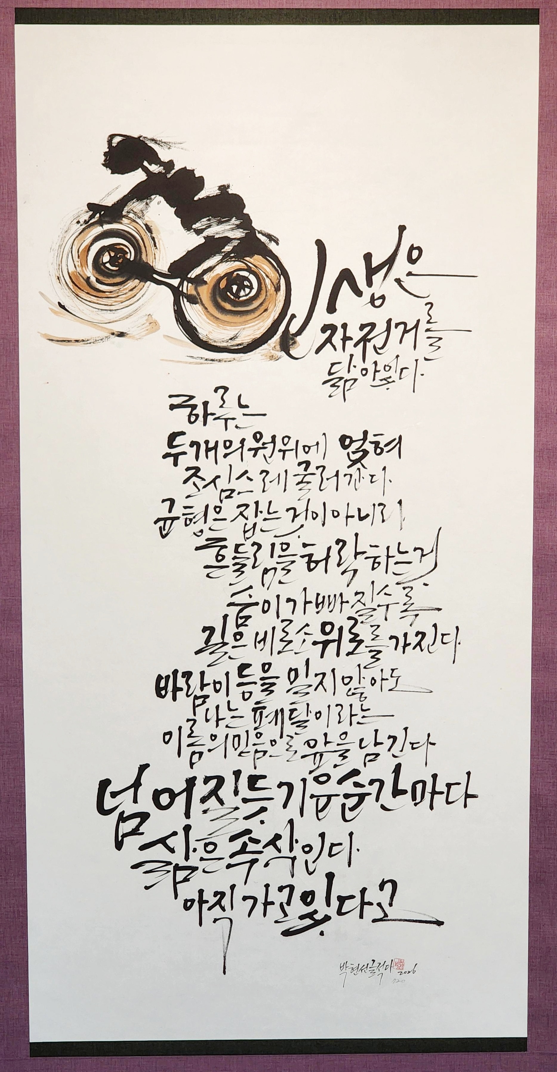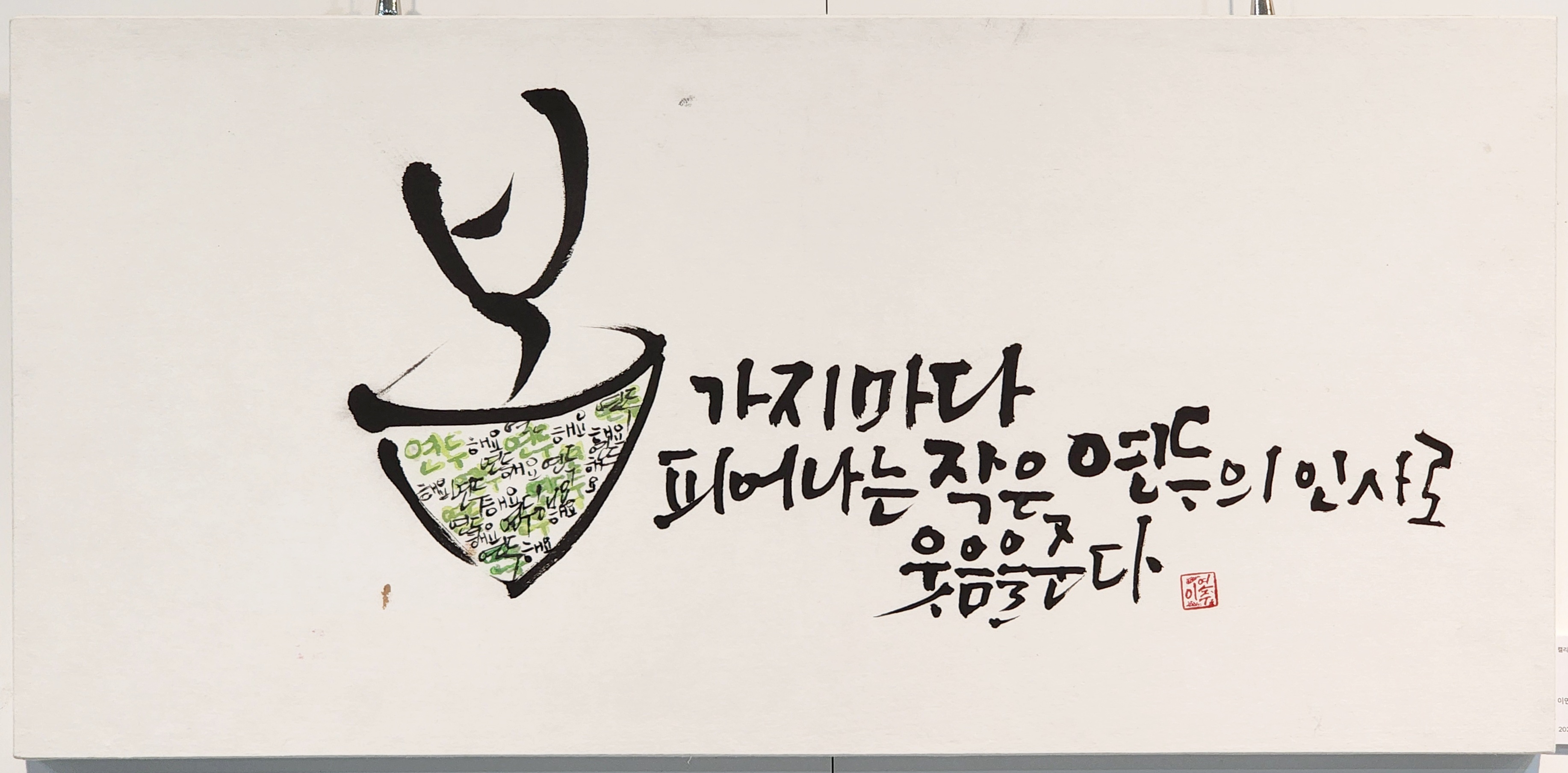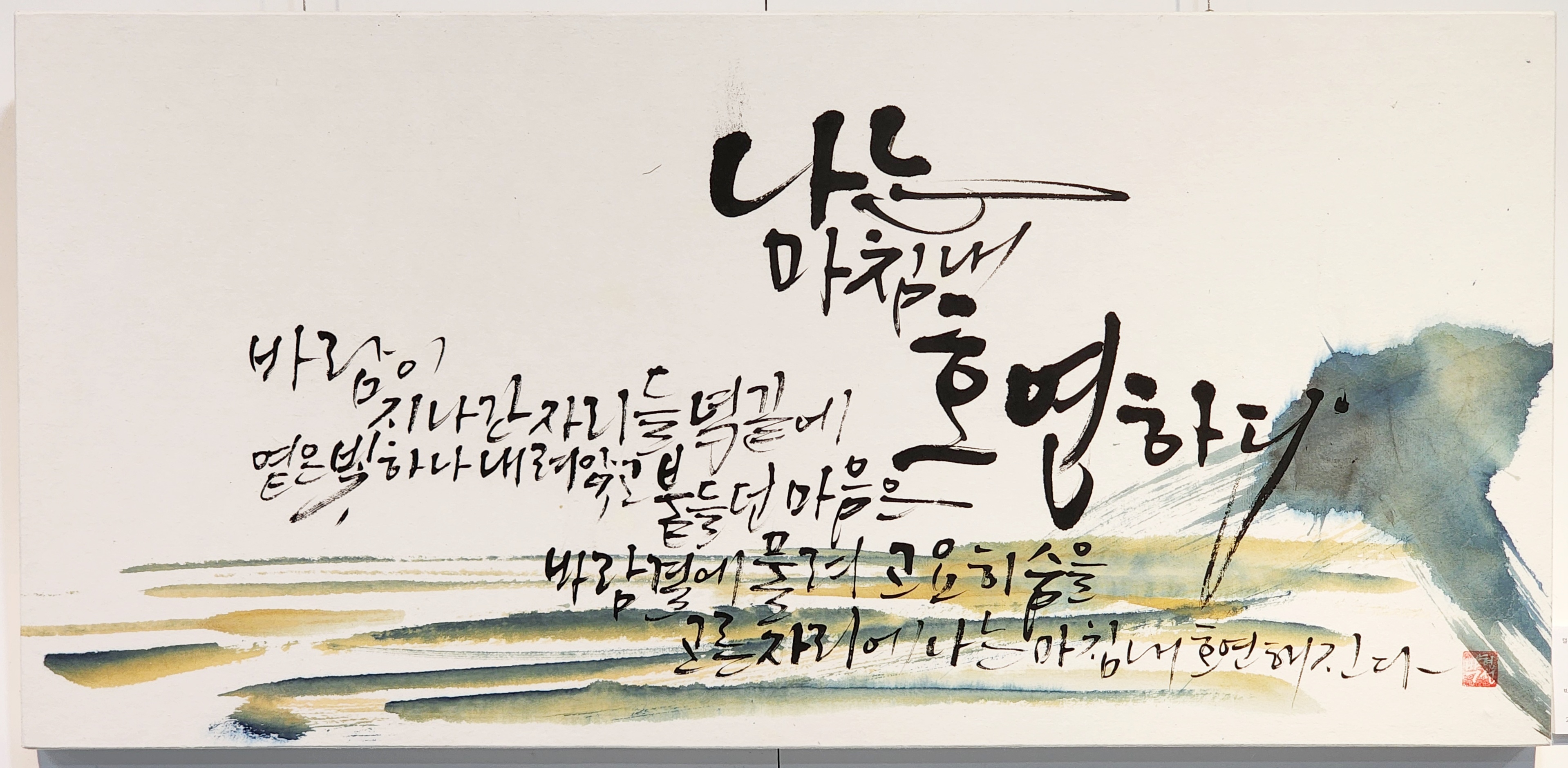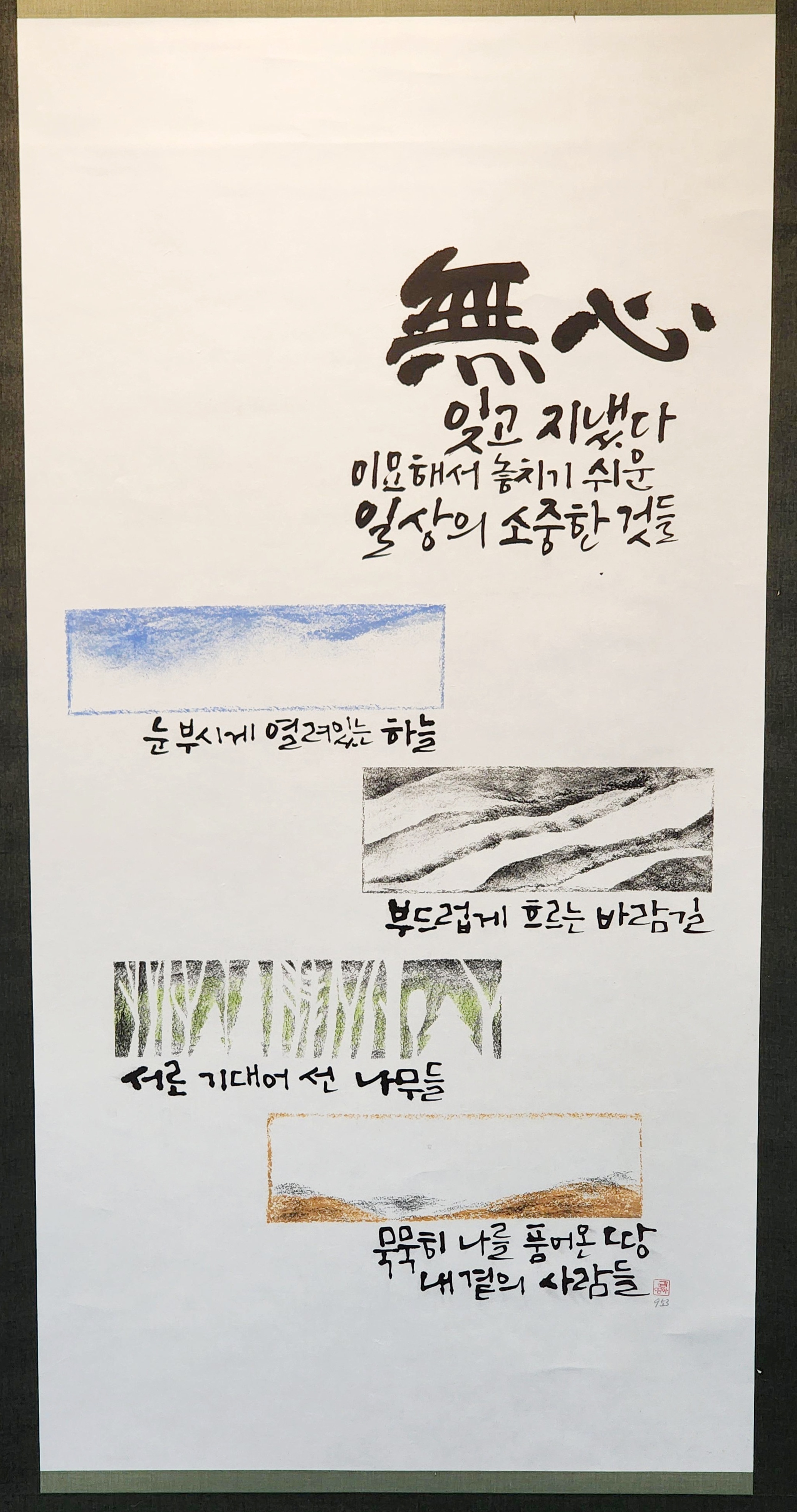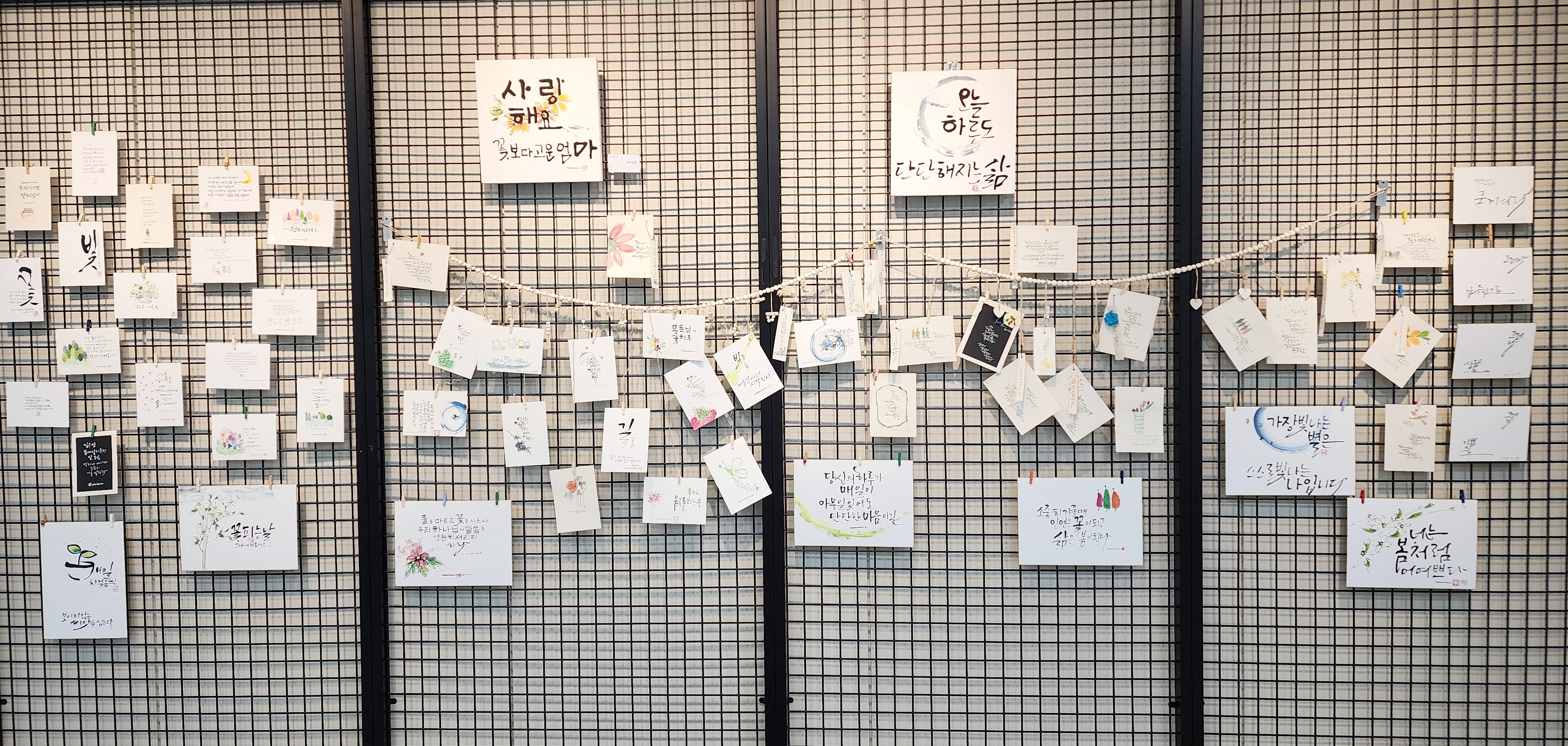 도서관 1층에 '미갤러리'가 있는데, 연중 쉬지 않고 다양한 전시회가 열린다. 지금은 '선의 자유'라는 제목으로 '캘리그래피 봄' 회원전이 열리고 있다. 자그마한 소품부터 수준 높은 작품까지 여러 솜씨를 살펴볼 수 있다. 마침 캘리그래피에 관심이 있던 터라 반갑게 둘러보았다. 이 정도로 붓을 자유자재로 휘두르자면 얼마나 수련을 해야 할까, 까마득하게 느끼면서.