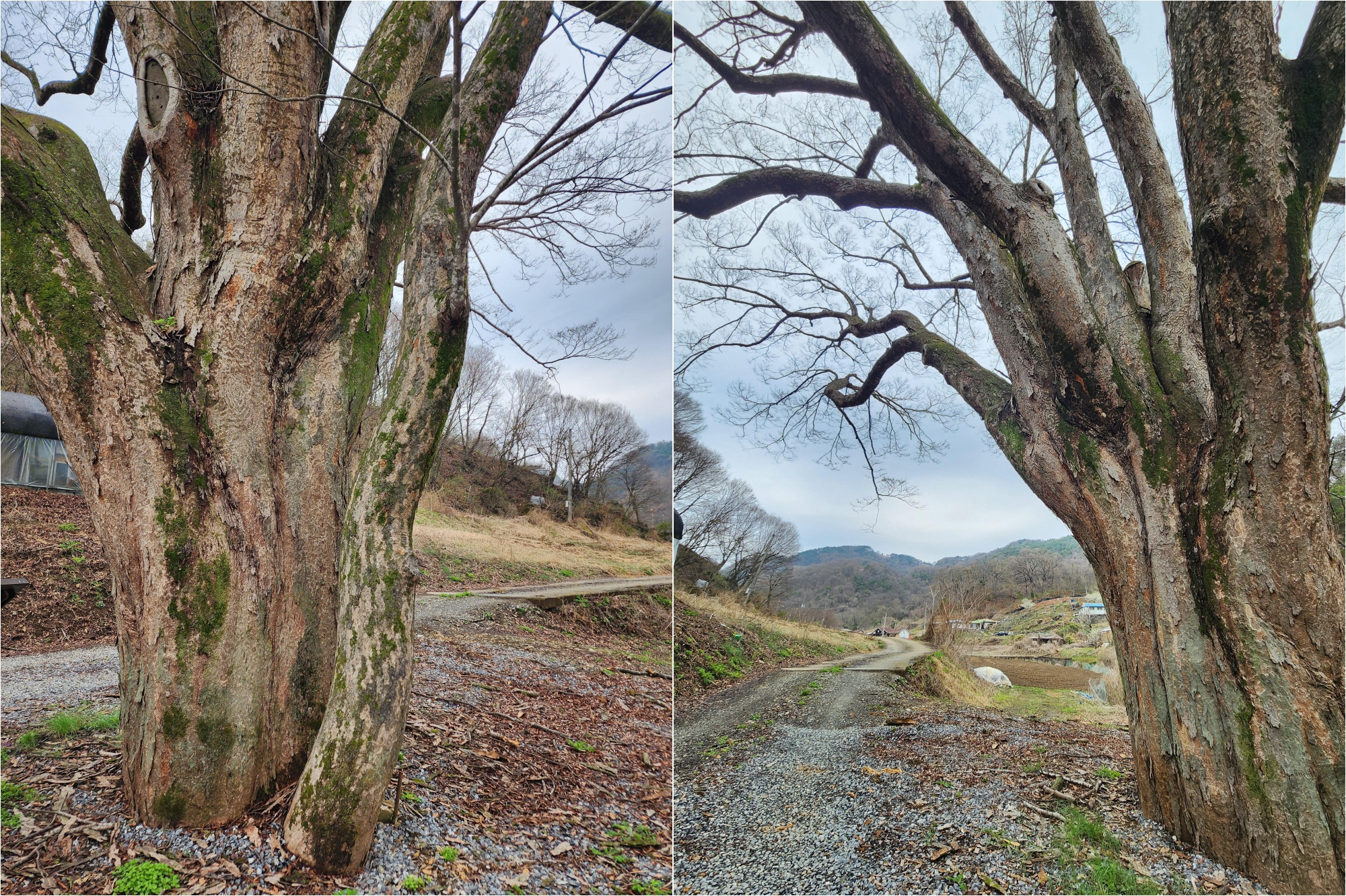 자료를 찾아보니 괴곡리는 1985년 충주댐 건설로 마을 대부분이 수몰되었다고 한다. 지금 보면 산자락을 따라 몇몇 집들이 남아 있다. 그렇다면 옛날 마을과 함께 많은 나무들도 사라졌을지 모른다. 다행히 이 나무는 위쪽에 있어 살아남았을지도. 나무 수령은 300년쯤 되었고, 높이는 17m, 줄기 둘레는 5.6m이다.