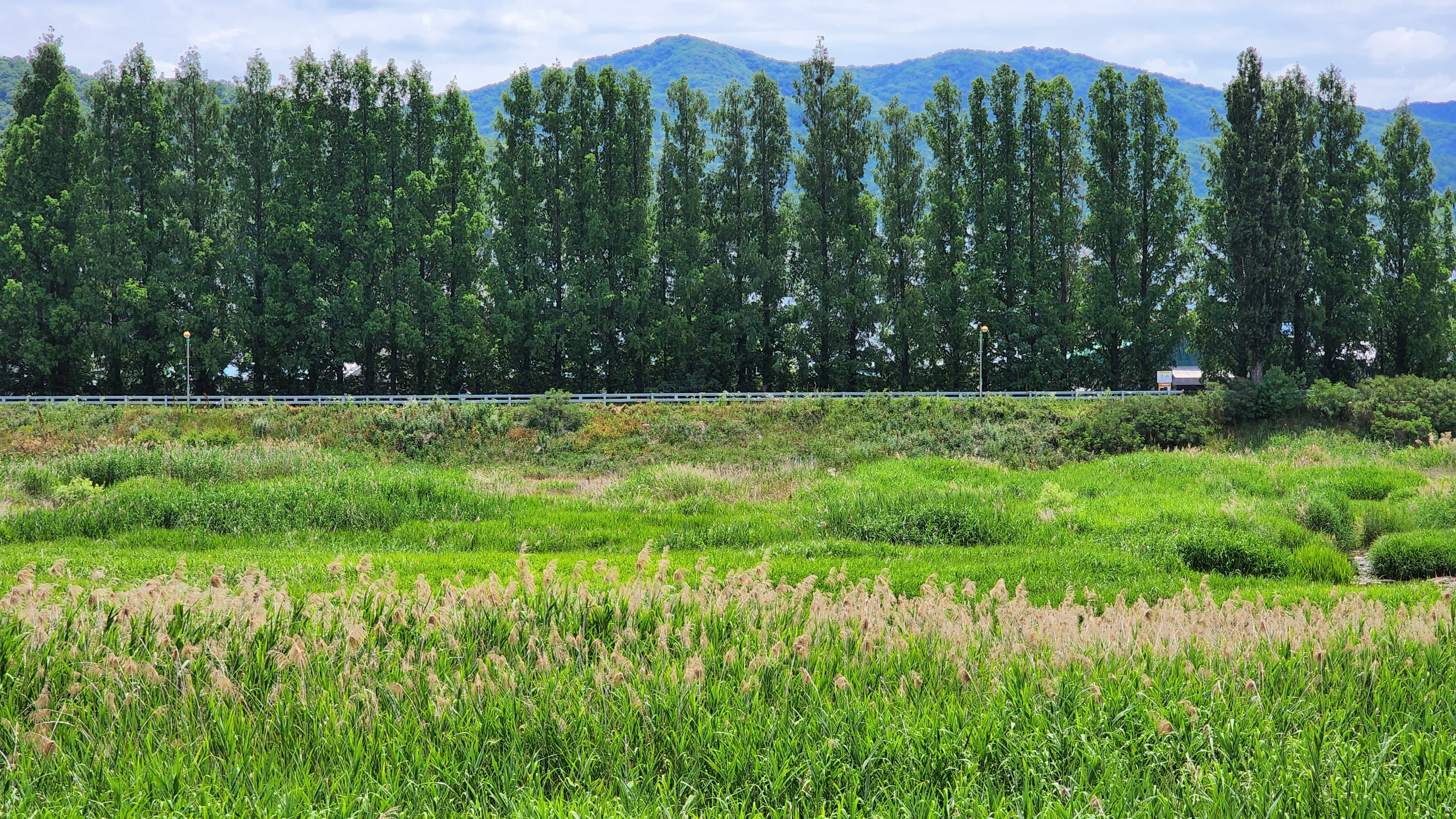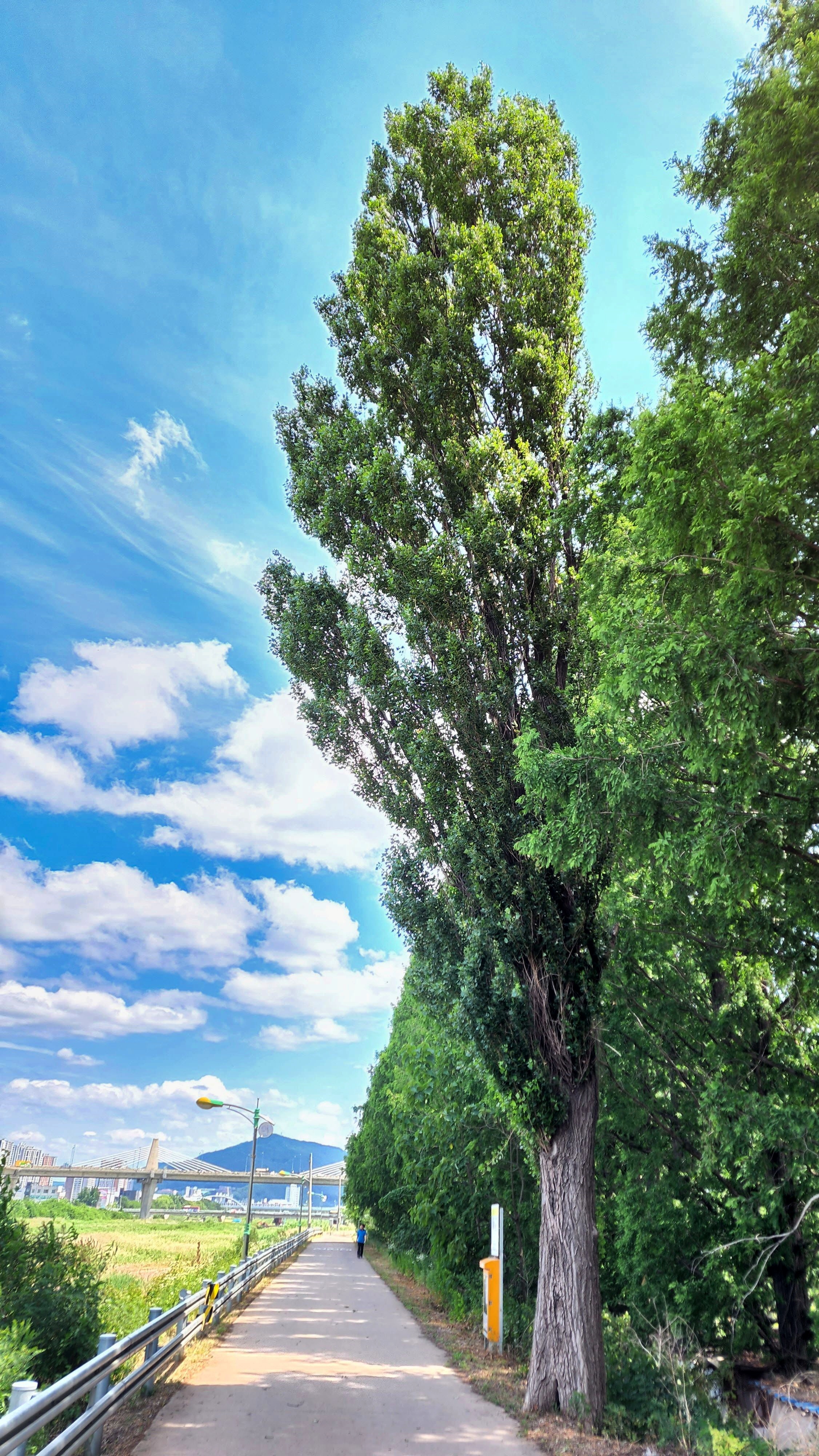 경안천변에 있는 몇 안 되는 양버들 중 하나다. 보통 미루나무로 부르는데 정확히는 양버들이다. 어릴 적에 신작로 가로수가 이 양버들이었는데 키다리 양버들이 수 km를 곡선을 그리며 도열해 있는 광경은 장관이었다. 고향에 있는 천변이나 저수지 둑에서도 자라고 있었다. 어린 시절을 추억하면 제일 먼저 떠오르는 나무가 양버들이다. 바람이 불면 잎들이 "차르르" 하면서 내는 소리는 지금도 귀에 선연하다.