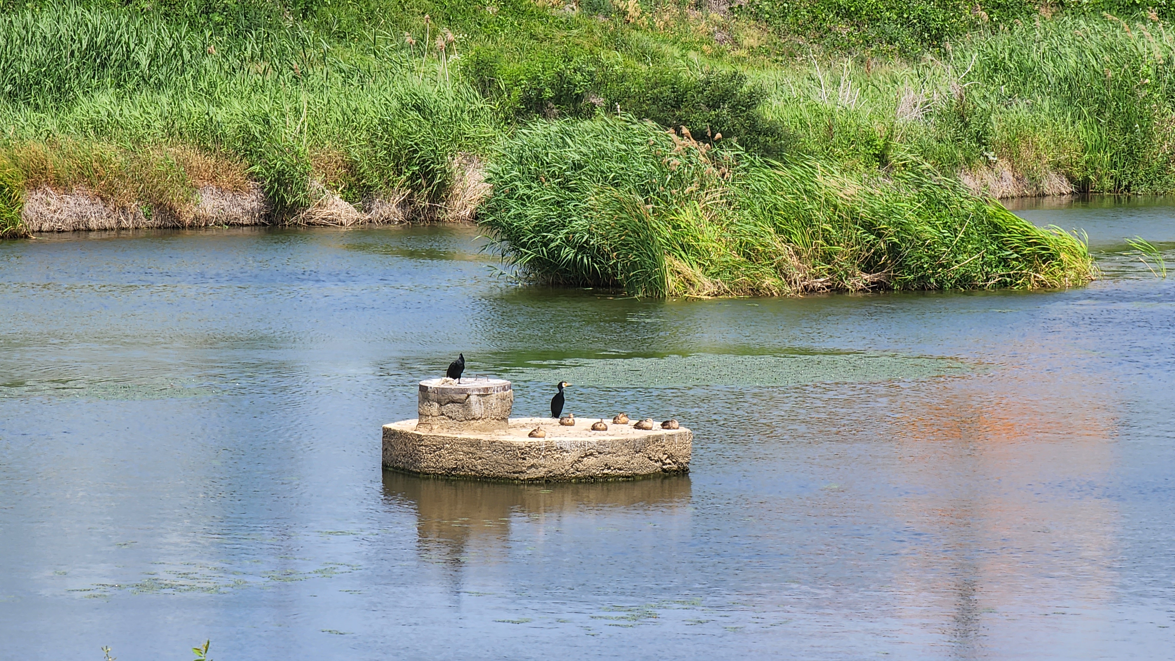 가마우지와 오리가 햇볕을 쬐며 쉬고 있다.