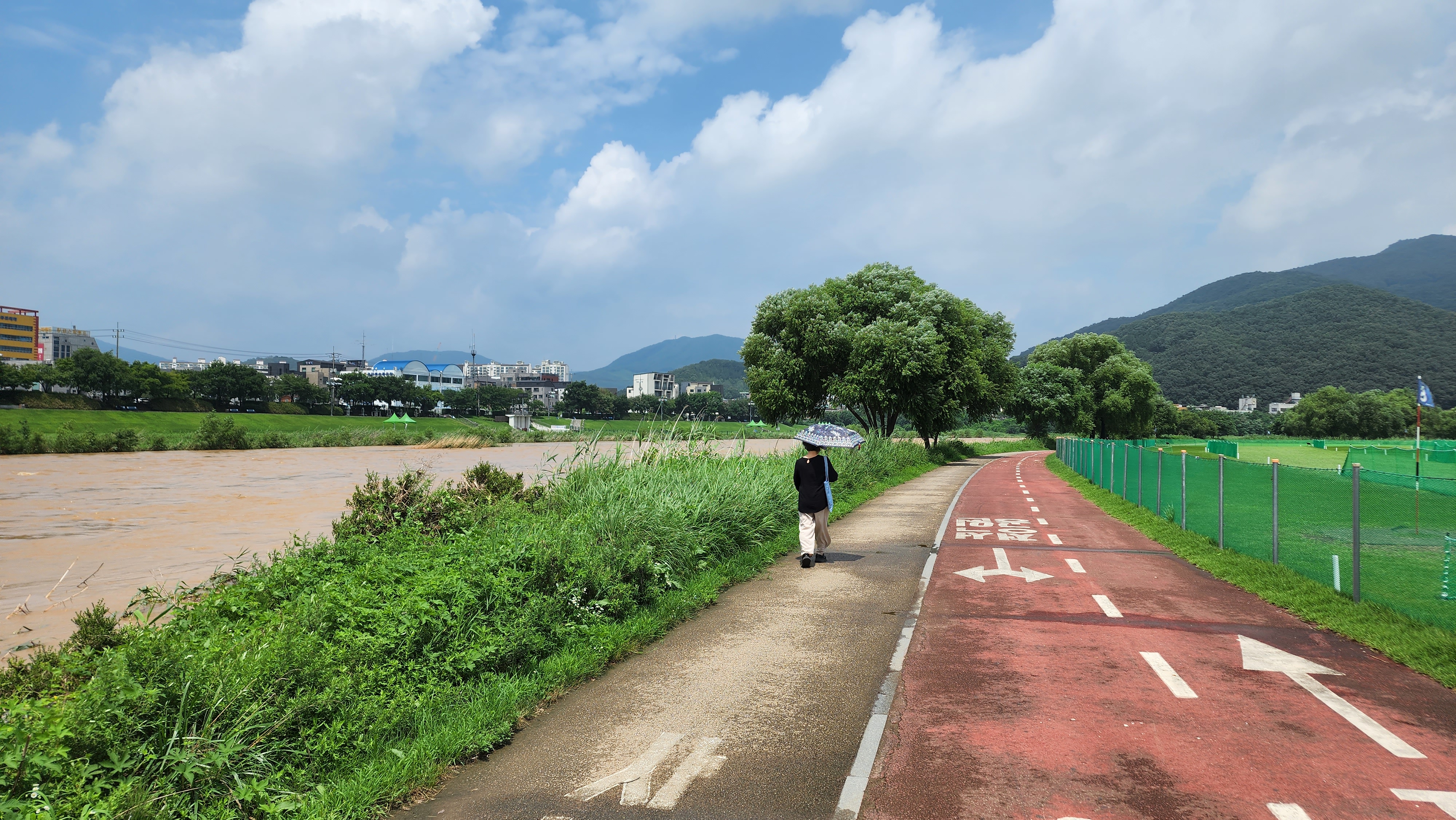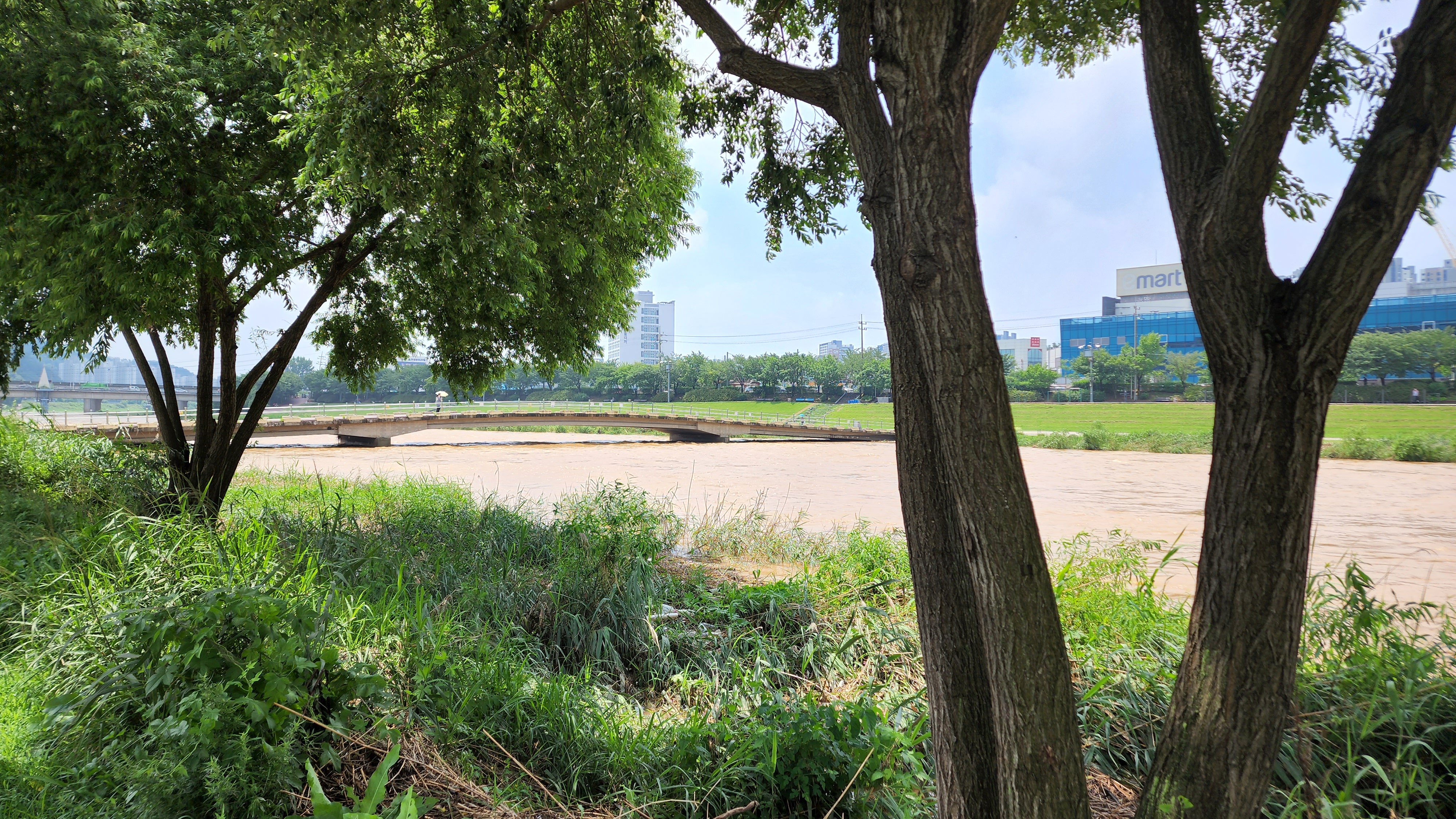 지난밤에 비가 많이 내린 뒤 경안천에 나가 보았다. 경안천변에 있는 한 음식점에서 친척 형님과 점심을 하고 난 후였다. 경안천은 흙탕물로 가득했고 둔치까지 물이 잠긴 흔적이 보였다. 오랜만에 보는 풍경이었다.