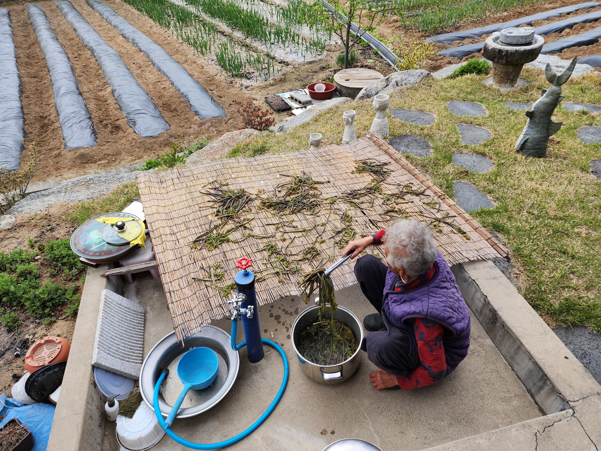 따온 고사리는 끓여서 마당에 말렸다. 날씨가 궂어지더니 바람이 세게 불면서 저녁에는 황사비가 내렸다.