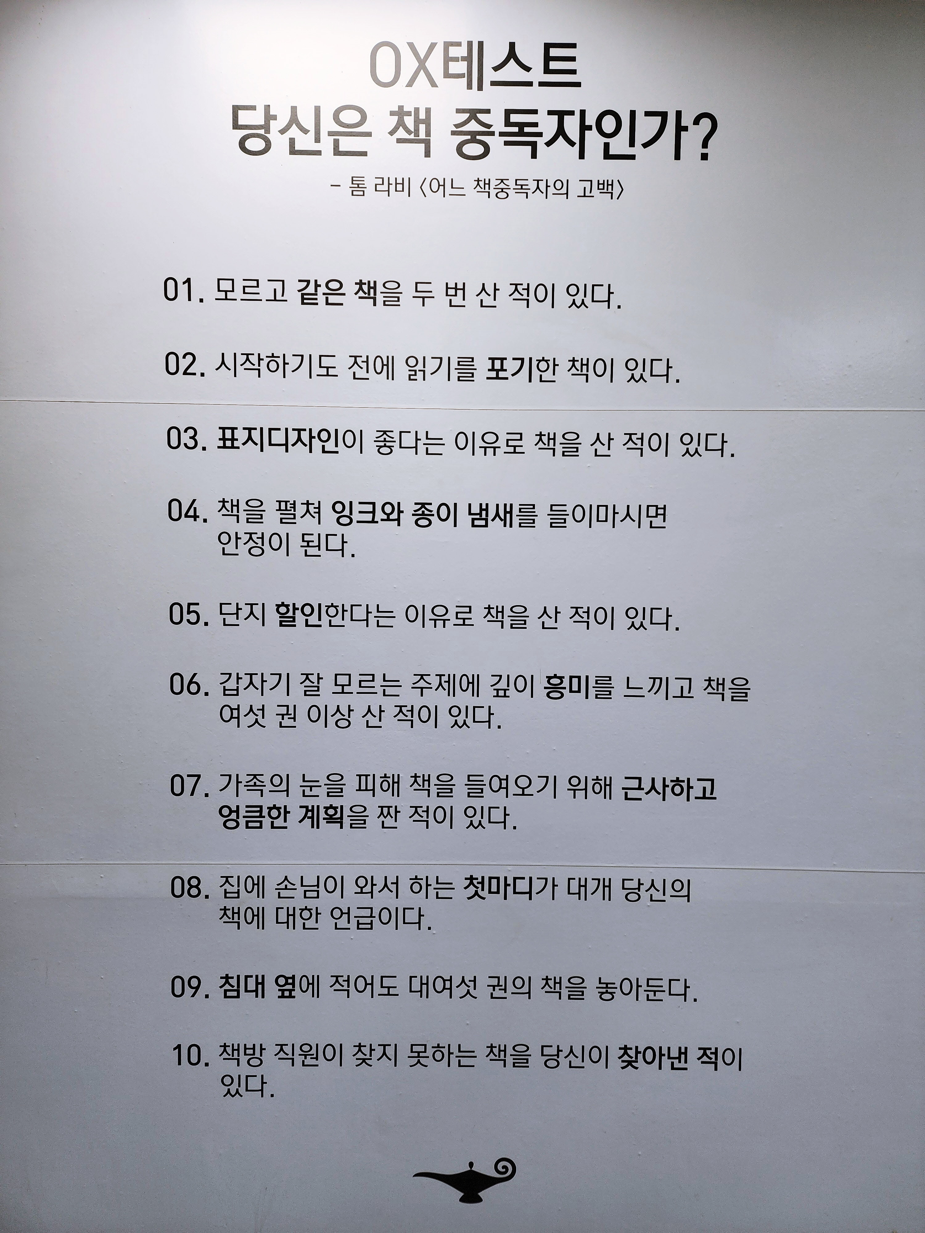입구에 있는 '당신은 책 중독자인가?'라는 게시문을 보면서 과거의 나를 돌아보았다. 여기서 '책 중독'이란 책 수집벽을 가진 사람을 말하는 것 같다. 마음에 드는 책을 내 것으로 만들지 않으면 못 배기는 때가 나에게도 있었지.